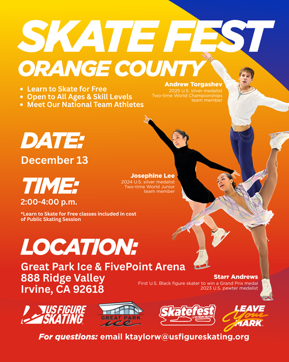U.S. Figure Skating, in partnership with The Rinks & Great Park Ice, will be hosting a SkateFest on Saturday, Dec. 13, from 2:00–4:00 p.m. featuring 2025 U.S. silver medalist Andrew Torgashev, 2024 U.S. silver medalist Josephine Lee and 2022 Skate Canada International silver medalist Starr Andrews!